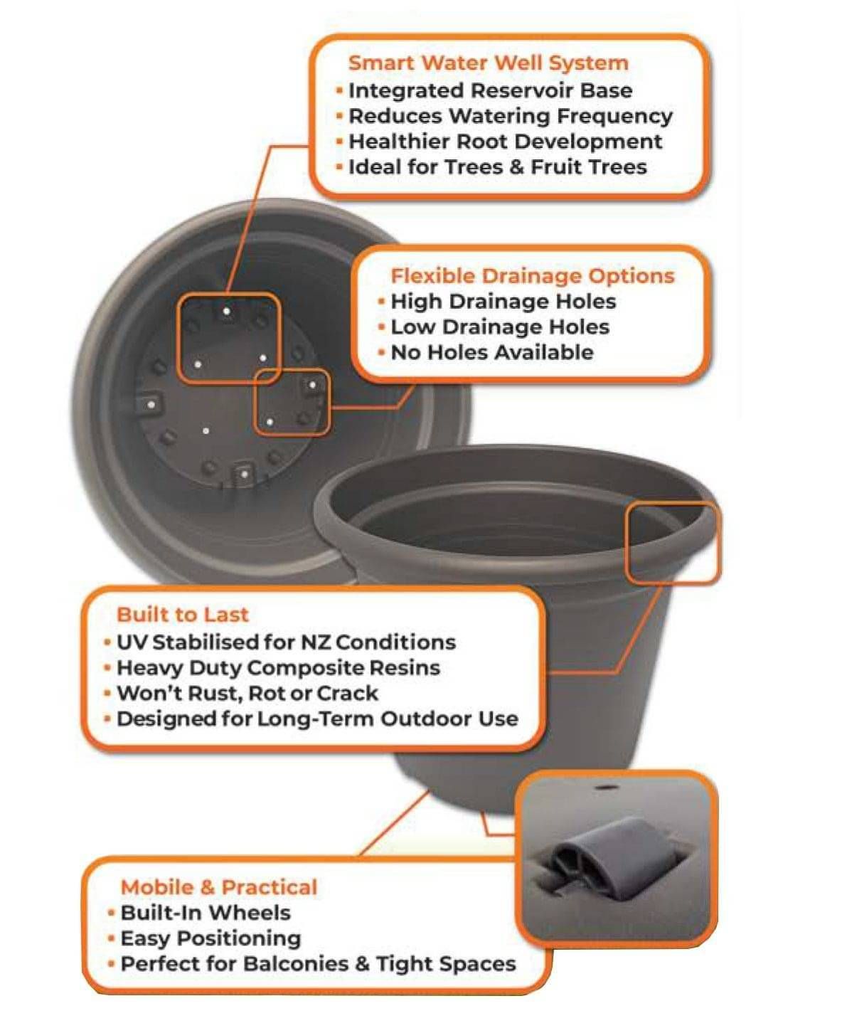 Made in New Zealand by MTD Dynamics, our Composite Planters are designed for those looking for reliable, durable composite planter pots. With years of experience in the industry, we offer practical advice and support to help you choose the best pots for your home or commercial use.