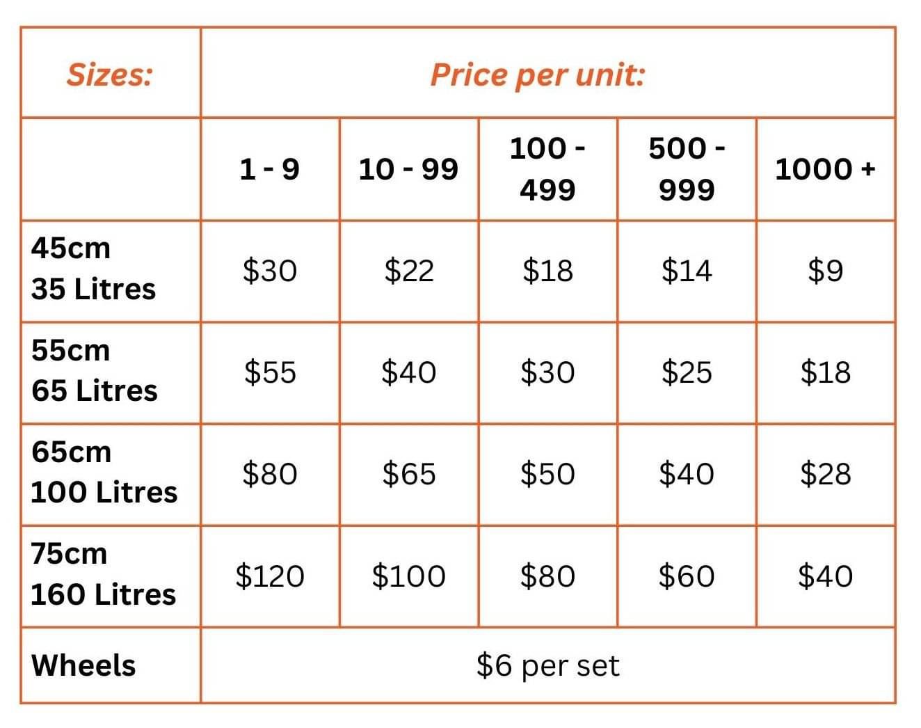 Pricing listed below is plus GST and freight. Bigger orders get bigger discounts.
